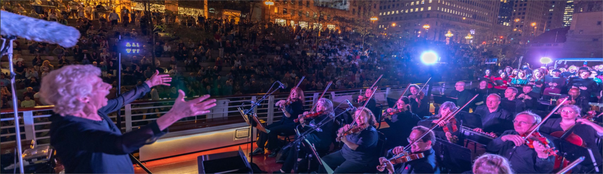 7:10 PM - Dame Jane Glover and the musicians travel from Riverwalk East End towards Merchandise Mart, performing en-route; the same program will be repeated for the duration of the evening